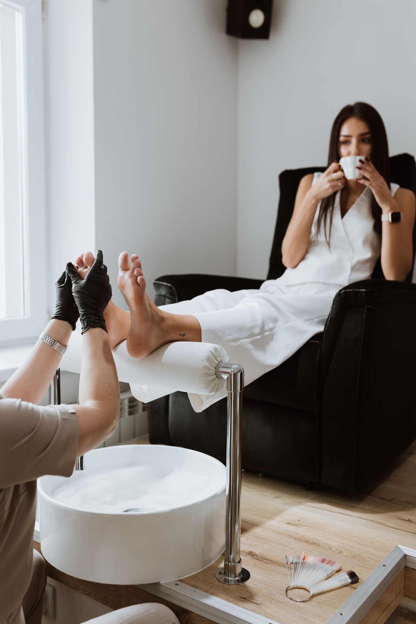 Zabieg rozpoczyna się kąpielą stóp w ciepłej wodzie z solą morską i olejkiem eterycznym, co zmiękcza naskórek i przygotowuje skórę do dalszej pielęgnacji. Następnie wykonywane jest usunięcie stylizacji hybrydowej oraz skrócenie i wygładzenie paznokci dla nadania im estetycznego wyglądu.